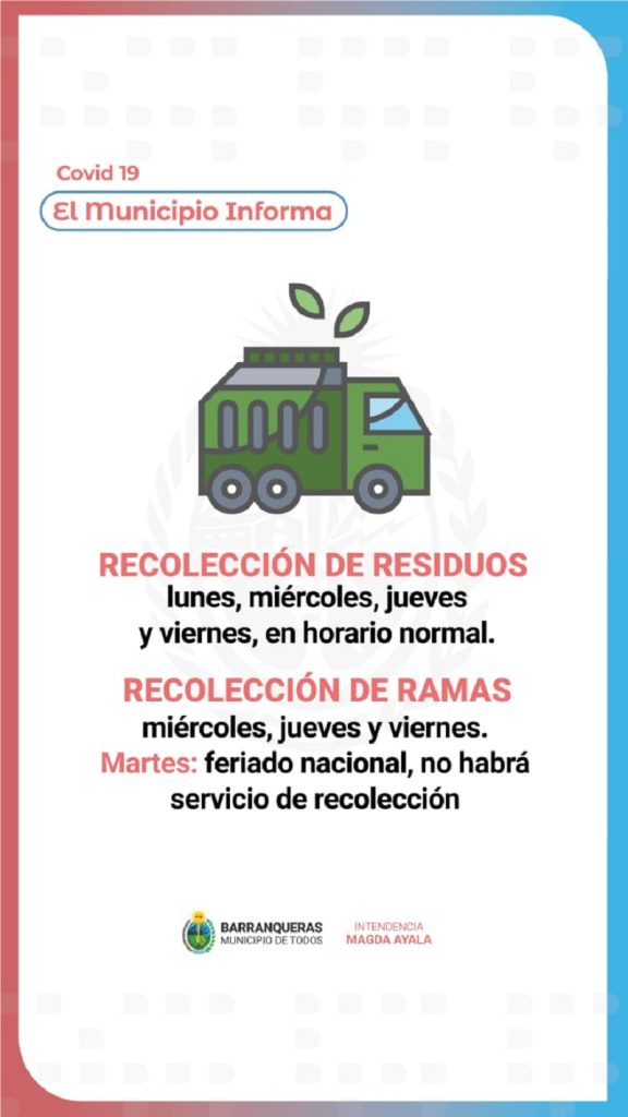 A partir de las nuevas medidas regulatorias en el marco de la pandemia por covid 19, el Municipio de Barranqueras informó los días y horarios de recolección de residuos para continuar llevando a cabo sus tareas municipales de limpieza a pesar de las nuevas regulaciones.