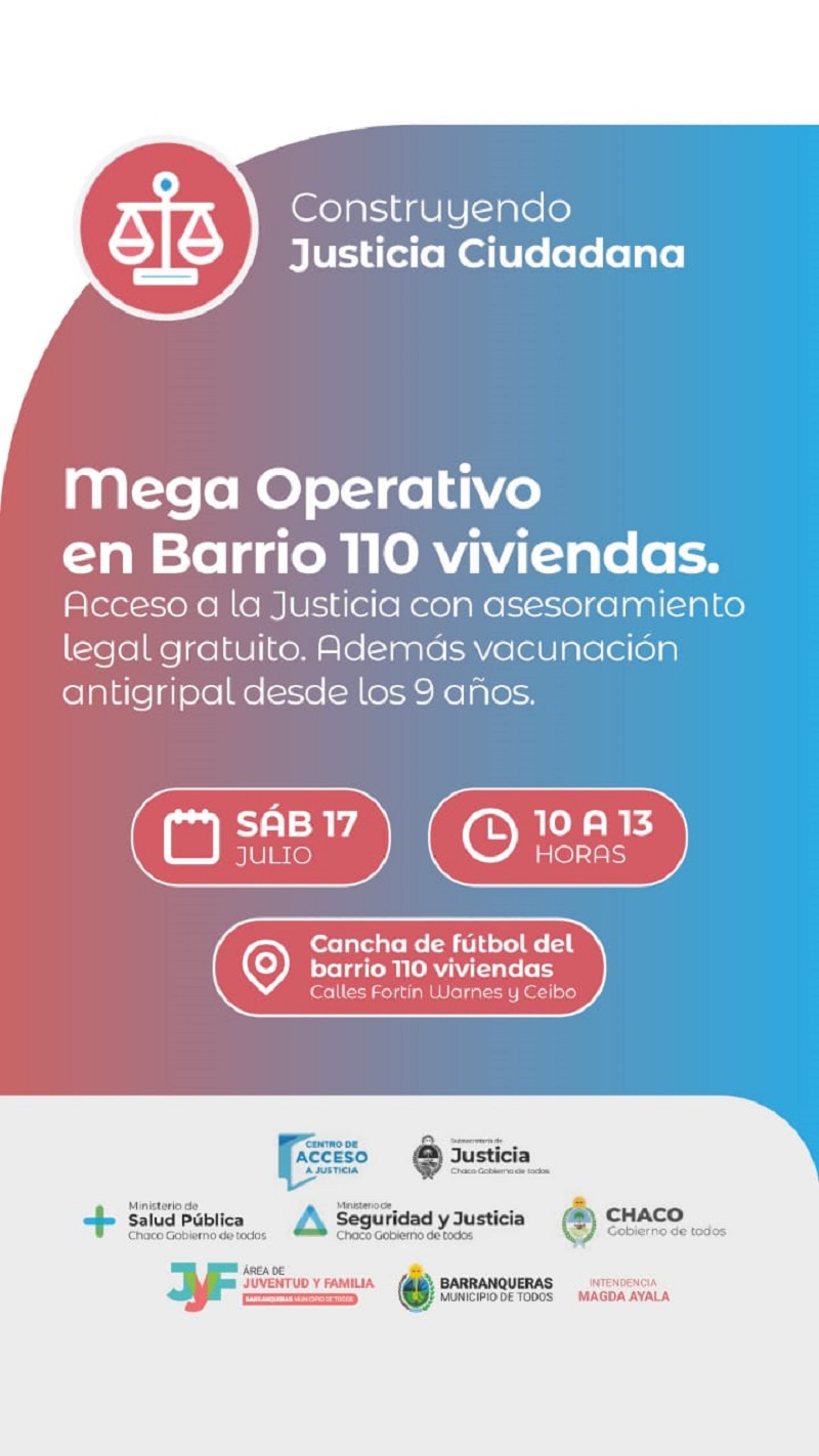 Este sábado 17, desde las 10 de la mañana y hasta las 13hs se extenderá un nuevo operativo de Acceso a la Justicia y Asesoramiento Legal, además de una campaña de vacunación antigripal para mayores de 9 años, en la cancha de futbol ubicada en Fortín Warnes y Ceibo del barrio 110 viviendas de la localidad portuaria.