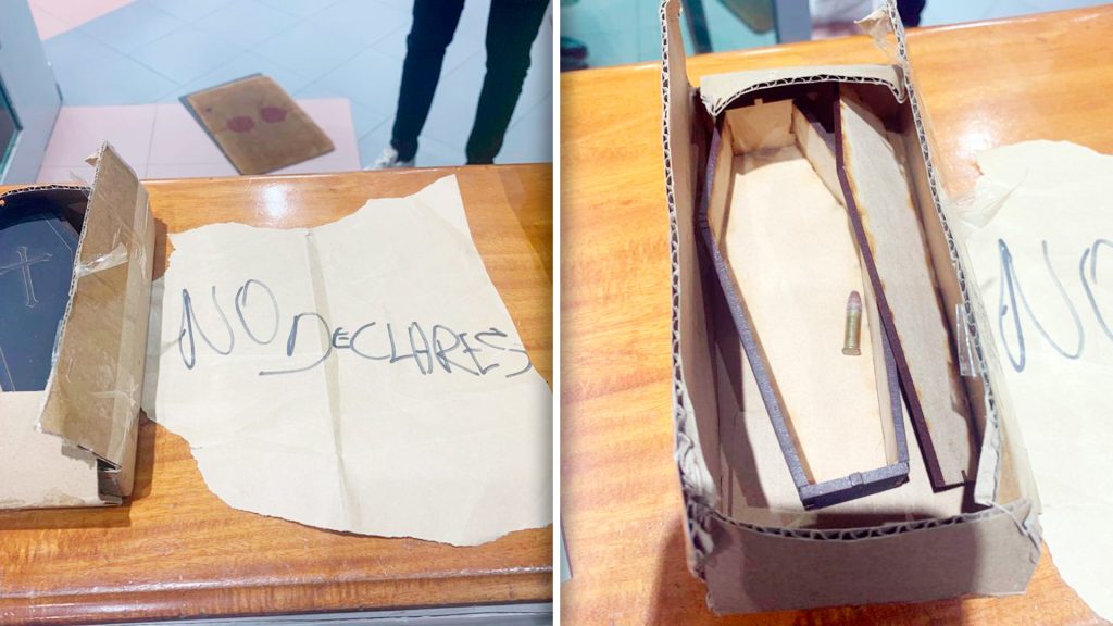 Otra de las intimidaciones que le llegaron a Monteverde fue a través de una caja de cartón que, en su interior, tenía un pequeño ataúd de madera con una bala y un mensaje que decía “No declares”, escrito con fibrón azul.