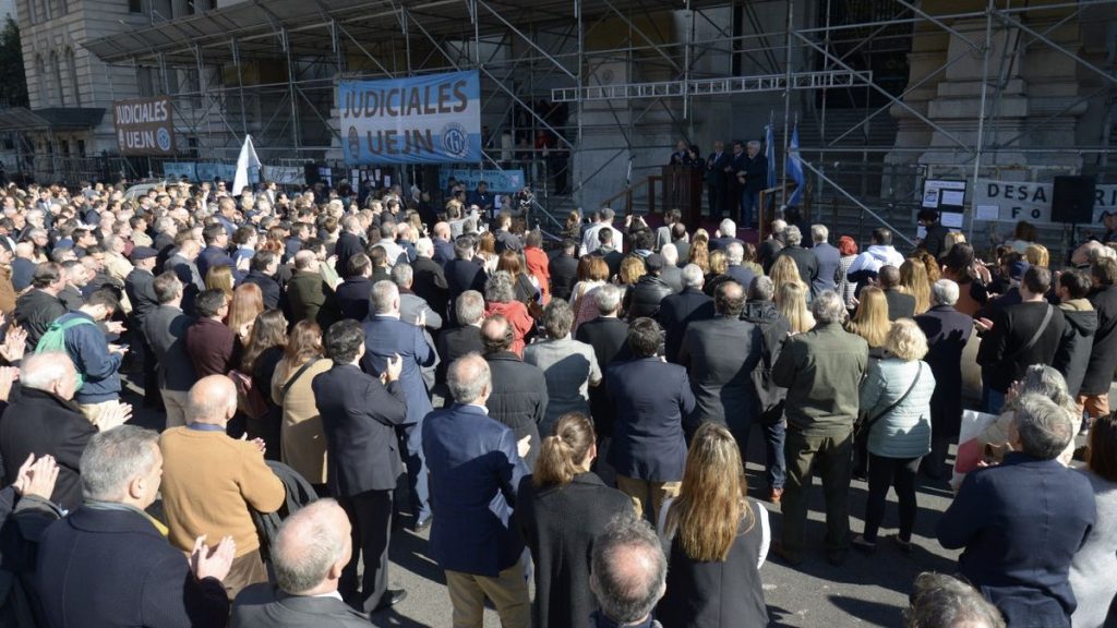 Por su parte, Julio Piumato, secretario general de la Unión de Empleados Judiciales de la Nación (UEJN) fue otro de los oradores que tuvo el encuentro. El representante gremial manifestó que “la Justicia tiene la responsabilidad de garantizarle a los argentinos un mínimo de derechos para vivir con dignidad”. Piumato cerró su discurso afirmando que “por hoy y por mañana necesitamos una Justicia independiente”.