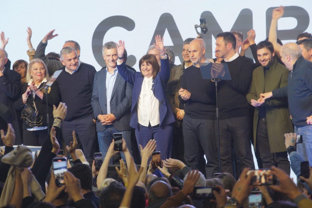 La exministra de Seguridad salió al escenario cerca de las 23.30 junto a su compañero de fórmula, el exdiputado Luis Petri, para luego invitar a dar un breve discurso a Rodríguez Larreta.