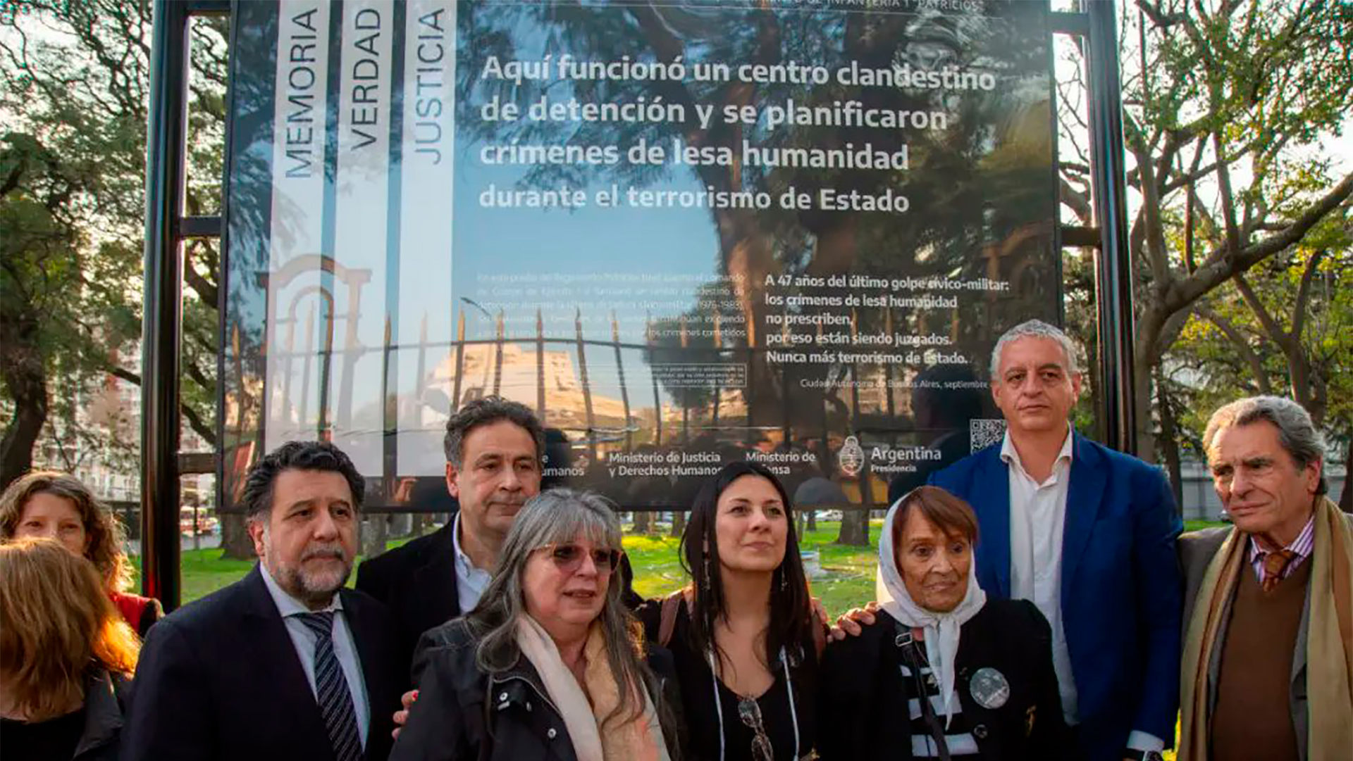 Antes de las palabras de los funcionarios, victimas y familiares, se descubrió el cartel por Memoria, Verdad y Justicia que señaliza los excentros clandestinos de detención y otros lugares donde sucedieron hechos emblemáticos durante el terrorismo de Estado. Estuvo presente también Taty Almeida, Madres de Plaza de Mayo Línea Fundadora.