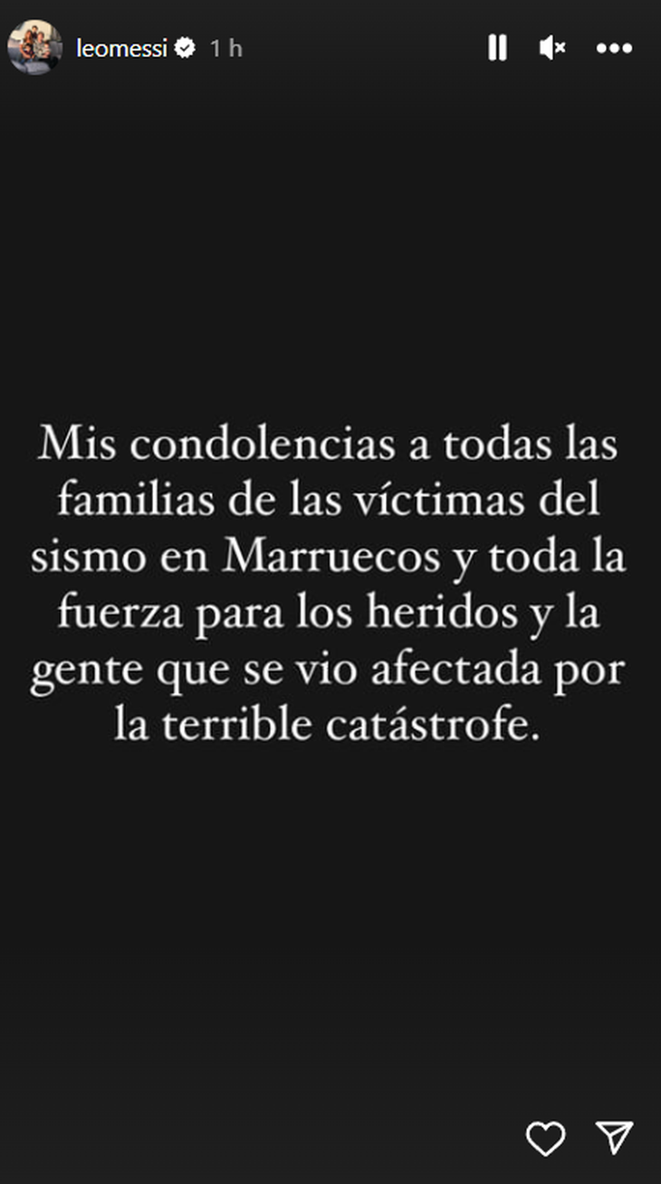 “Mis condolencias a todas las familias de las víctimas del sismo en Marruecos, y toda la fuerza para los heridos y a la gente que se vio afectada por terrible catástrofe”, dijo Leo en una historia. Así hizo referencia al fenómeno que fue, con una magnitud de 6,8 en la escala de Ritcher, el más fuerte del país en un siglo.