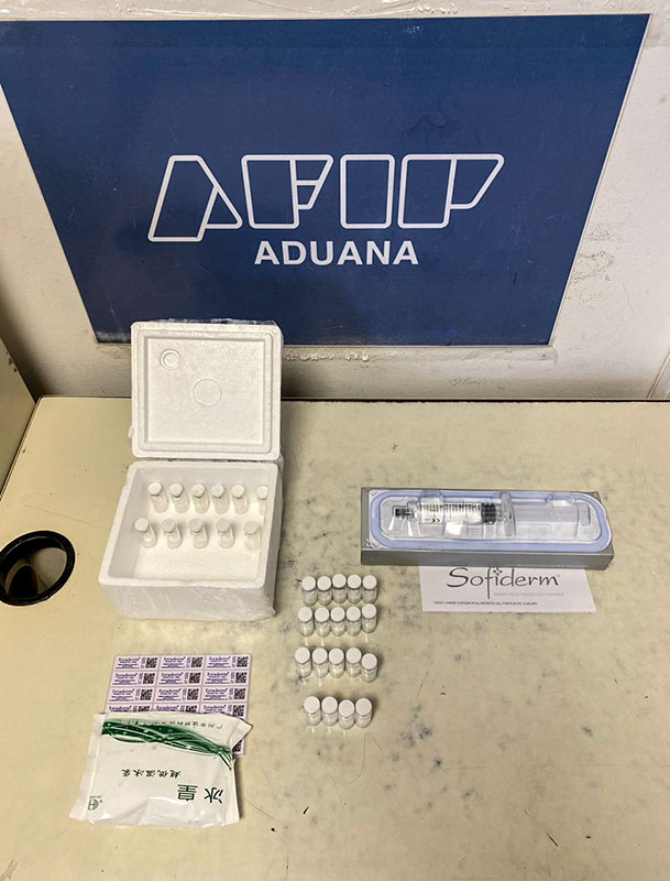 Según lo informado por Aduanas, dentro de la caja de madera había un envase de telgopor que contenía 30 ampollas con una sustancia utilizada para lifting facial, de marca Israderm, y una jeringa con ácido hialurónico, marca Sofiderm.