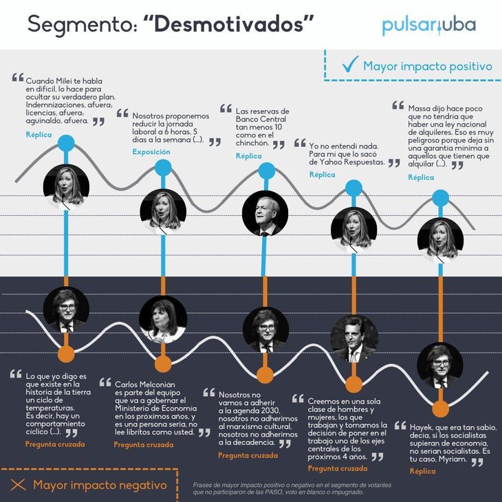 A diferencia de los anteriores, Bullrich tuvo un mejor desempeño en cuanto a la búsqueda del voto rival ya que, según destacaron desde Pulsar, logró que la escucharan los votantes de La Libertad Avanza. “Sus momentos de mayor impacto los logró con la complicidad de los electores de Javier Milei”, apuntaron, y además encontró reacciones favorables de los desmotivados.