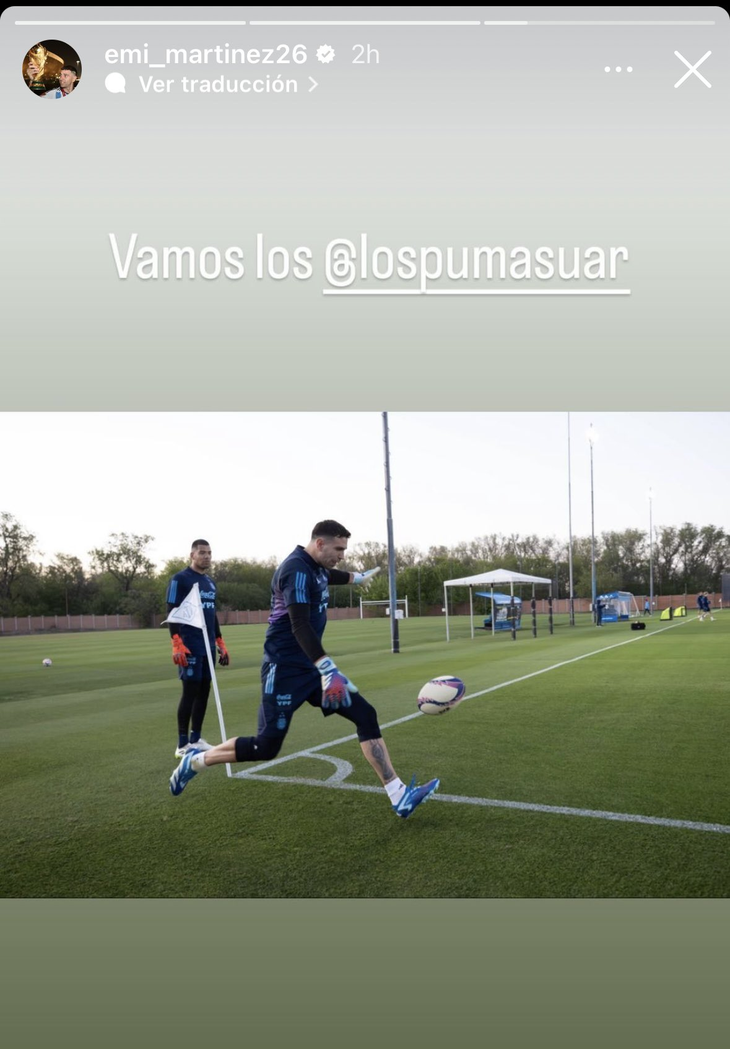 “Vamos Los Pumas”, escribió el arquero del Aston Villa por medio de las historias de Instagram, junto a una foto de él mismo en el entrenamiento del conjunto nacional en el Predio de Ezeiza en donde está pateando una pelota de rugby cerca de uno de los córners del campo de prácticas.