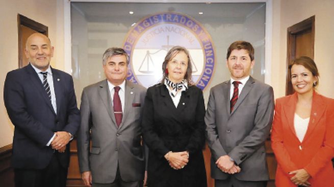 EQUIPO. Los referentes de la lista Bordó (de izquierda a derecha) Diego Barroetaveña, además Consejero; el presidente saliente Marcelo Gallo Tagle, la nueva vice María Elena López y el nuevo presidente Andrés Basso junto a la jueza consejera Agustina Díaz Cordero