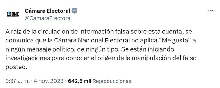 El organismo electoral se defendió de la información falsa a través de la red social X (ex Twitter): “A raíz de la circulación de información falsa sobre esta cuenta, se comunica que la Cámara Nacional Electoral no aplica ‘Me gusta’ a ningún mensaje político, de ningún tipo. Se están iniciando investigaciones para conocer el origen de la manipulación del falso posteo”.