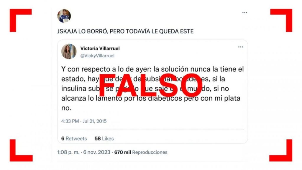 Circula en redes sociales un supuesto mensaje publicado en X (antes Twitter) de la candidata a vicepresidenta por La Libertad Avanza, Victoria Villarruel, donde rechaza el subsidio a los medicamentos. “La solución nunca la tiene el Estado, hay que dejar de subsidiar boludeces, si la insulina sube se paga lo que sale en el mundo, si no alcanza lo lamento por los diabéticos pero con mi plata no” , habría escrito la candidata en su cuenta oficial de Twitter el 21 de julio de 2015. Pero la captura que circula de ese supuesto mensaje es falsa.