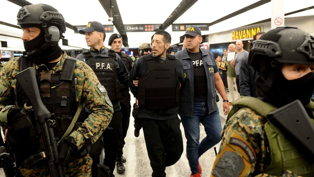 Escoltado por personal de Interpol Argentina, “Dumbo” Maylli Rivera llegó esposado en un vuelo de la empresa Latam que tocó tierra después de las 18 en el Aeropuerto Internacional de Ezeiza, y desde allí será llevado bajo un fuerte operativo de seguridad a la alcaidía de la Superintendencia de Drogas Peligrosas de la Policía Federal Argentina, donde aguardará ser indagado por el juez federal número 11 Julián Ercolini.