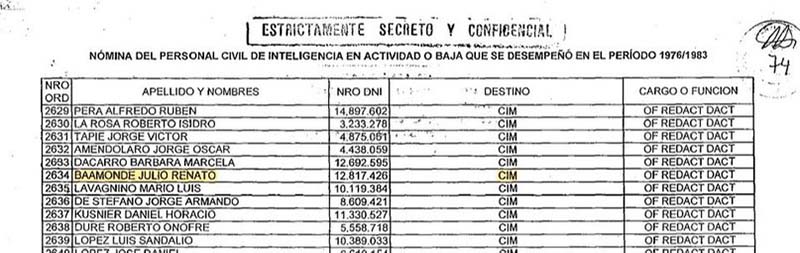 Baamonde había sido denunciado por su participación en el Batallón 601 de la última dictadura cívico–militar, ya que figura en la lista de Personal Civil de Inteligencia entre 1976 y 1983 en la Central de Inteligencia Militar.