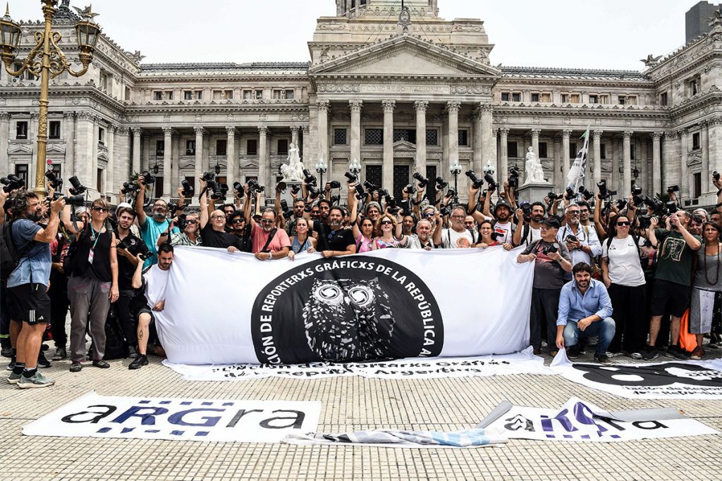 Reporteros gráficos nucleados en la Asociación de Reporteros Gráficos de la República Argentina (Argra) realizaron esta tarde un «camarazo» frente al Congreso para denunciar la represión que sufrieron decenas de periodistas por parte de fuerzas de seguridad durante las jornadas de movilización contra la ley de ‘Bases’ la semana pasada.