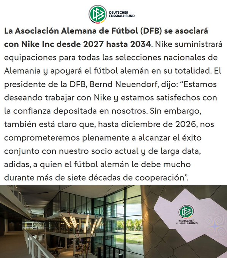 La DFB ya había anticipado una reacción negativa. “Entendemos la emoción”, declaró en X horas después del anuncio del contrato. La separación con Adidas “no nos deja indiferentes”.