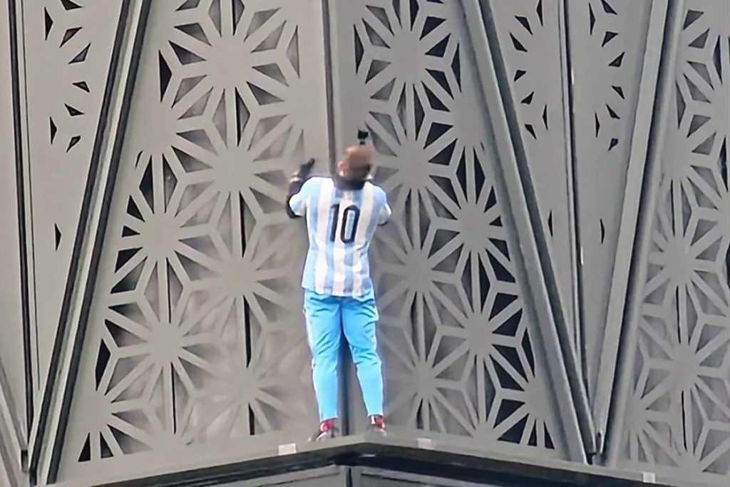 El hombre de 36 años, identificado como Marcin Banot, vestía una camiseta de la Selección Argentina con la 10 de Lionel Messi, sin ningún elemento de seguridad, cuando comenzó su proeza de subir el edificio de IRSA, donde funcionan empresas tecnológicas como Globant, situado en Della Paolera al 200, en el exclusivo barrio porteño.