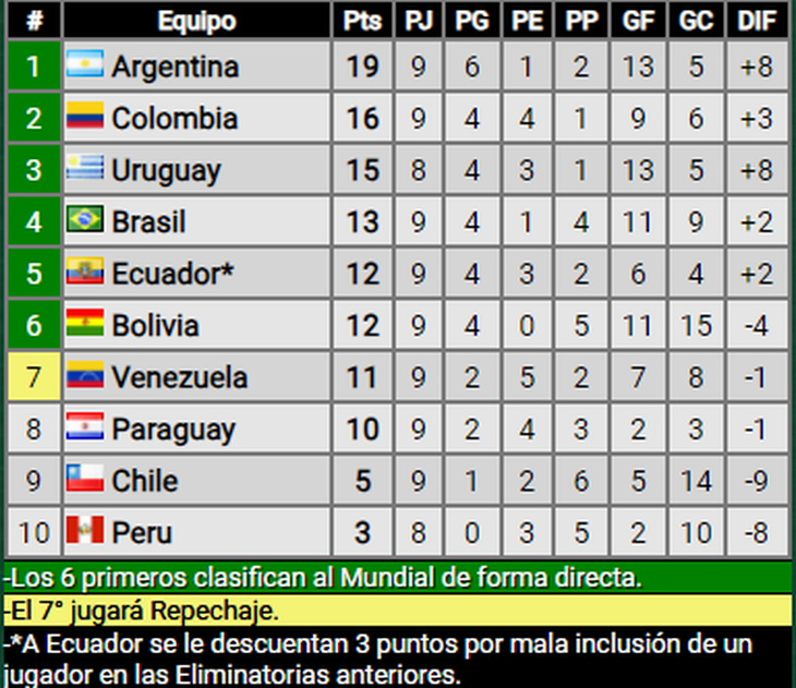 Teniendo en cuenta esto, la Selección campeona del mundo y bicampeona de América está siete puntos por encima de Bolivia, que ocupa el último cupo de clasificación directa, y mantuvo los ocho puntos de diferencia con Venezuela, que se encuentra en el puesto de repechaje.