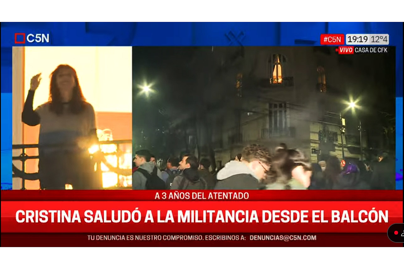 Cristina mantuvo una salida al balcón por espacio de un par de minutos, siempre muy sonriente y emocionada. Continuamente por ese lapso, saludó con ambas manos, agradeciendo a las muestras de afecto. Los cánticos, mientras flameaban banderas argentinas. Muchos de los centenares que estaban en la acera entonaron el clásico “¡Fuerza Cristina!”.