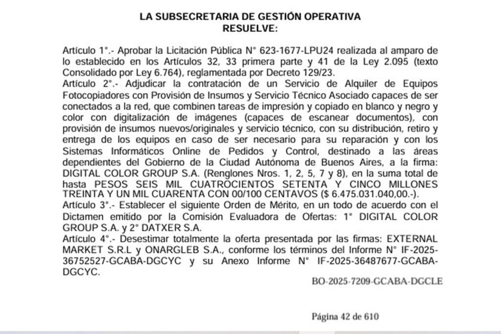La Licitación Pública N° 623-1677-LPU24, adjudica la contratación de un “Servicio de Alquiler de Equipos Fotocopiadores con Provisión de Insumos y Servicio Técnico Asociado”. El gasto es para las tareas de impresión y copiado en blanco y negro y color con digitalización de imágenes.