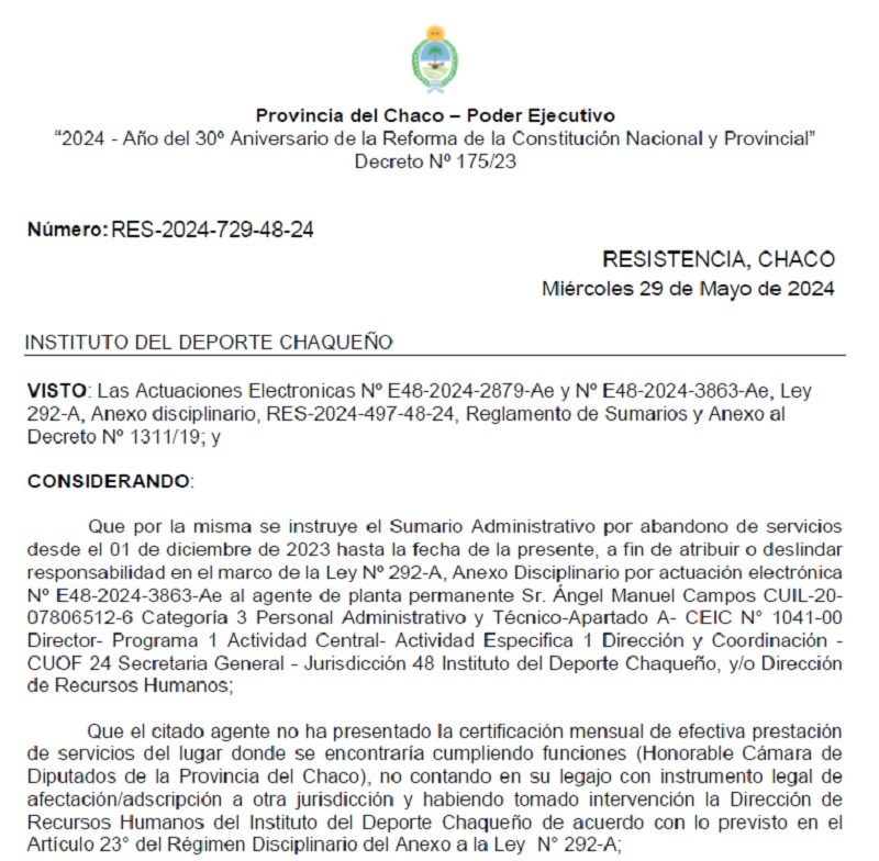 POR PRESUNTOS DELITOS DE FALSEDAD DOCUMENTAL, INCUMPLIMIENTO DE LOS DEBERES DE FUNCIONARIO PÚBLICO EN EL PROCESO DE SUMARIO ADMINISTRATIVO DE UN EMPLEADO DEL INSTITUTO DEL DEPORTE CHAQUEÑO REALIZADO POR RESOLUCION 729/2024 DE FECHA 29 DE MAYO DE 2024 DEL INSTITITUO DEL DEPORTE QUE ALEGO “ABANDONO DE SERVICIO”